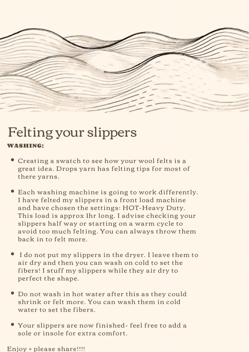 Get ready to crochet and felt your way to the coziest slippers ever! This playful crochet PDF pattern transforms basic stitches into adorable felted slippers that'll have your feet doing a happy dance. Watch your creation come alive as you crochet, then witness the transformation during the felting process. Grab your hook, download instantly, and start crafting slippers that are as fun to make as they are to wear. Pattern is made for size 7.5-8 but explains how to adjust for other sizes.. *NOT A PHYSICAL PRODUCT-PDF ONLY*